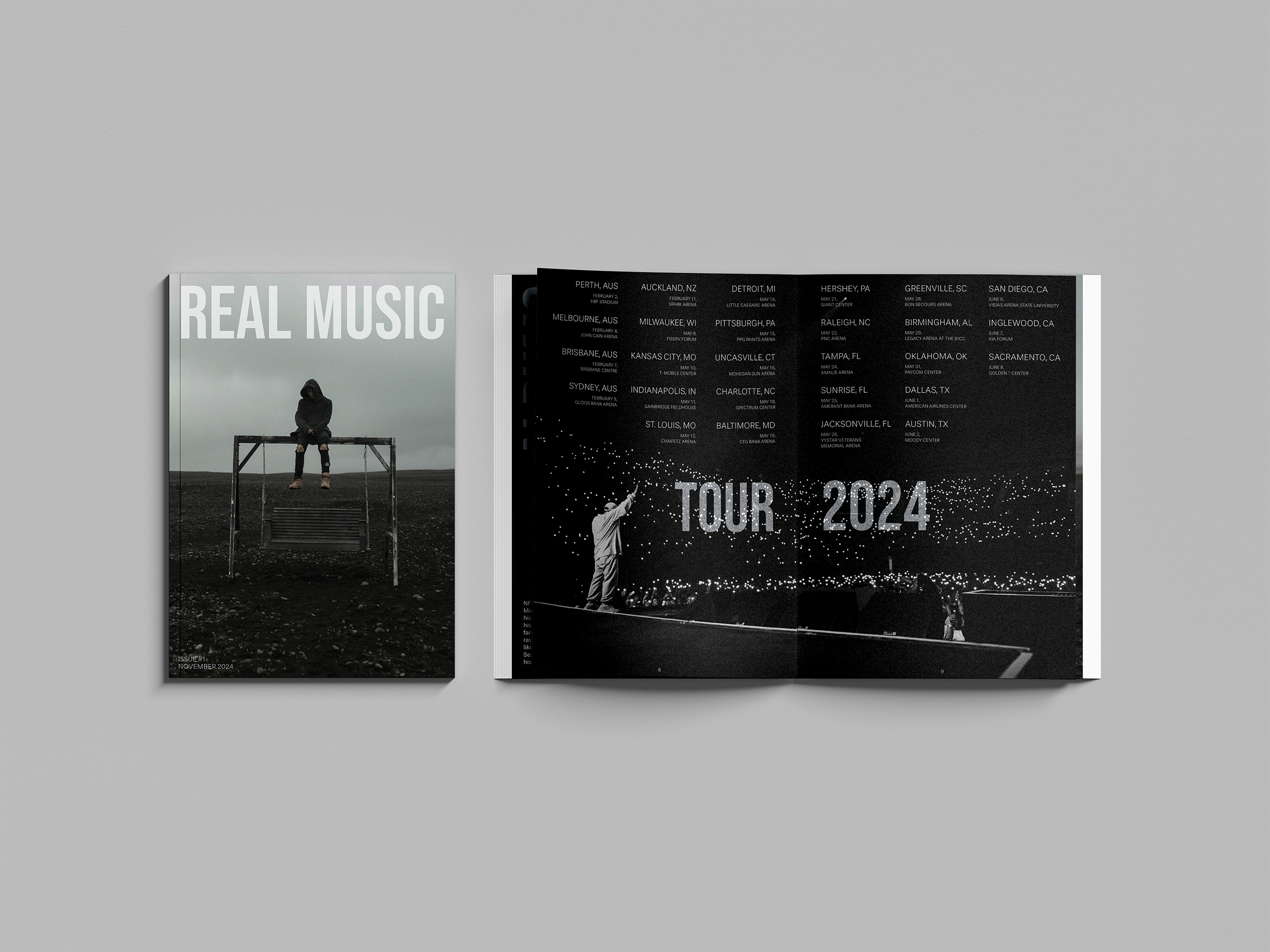 My first step in designing the magazine was defining its fonts and color scheme, drawing inspiration from NF’s minimalist aesthetic seen across his music videos, album covers, and social media. I chose a black, white, and blue-accented palette and selected Stevie Sans Light for body text and subheads, paired with Bebas Neue Regular for bold titles. I prioritized simplicity and legibility in body text, while allowing titles to be more visually striking. Influenced by my own preferences and design research, I focused on strong visual hierarchy, impactful full-spread imagery, and minimal text. I also used small, unobtrusive page numbers to maintain the immersive experience. Where possible, I balanced image-heavy spreads with substantial written content on adjacent pages. The design system extends across posters, signage, and merchandise, always maintaining clarity and adaptability.